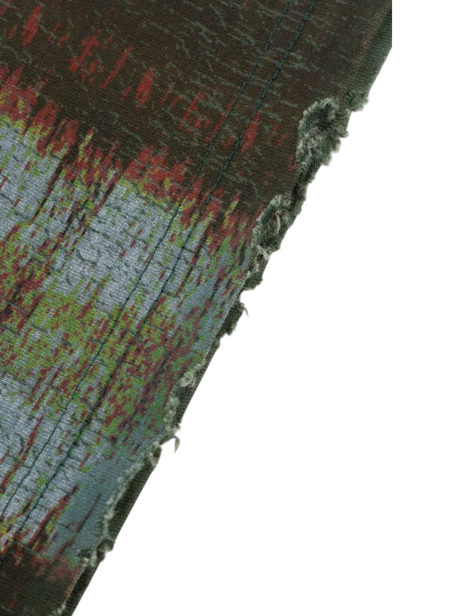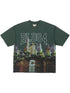 A graphic knit built loud from the front and worn in at the edges. The Big C Knit is cut from midweight cotton jersey in a relaxed drop-shoulder silhouette and finished with a snow wash that gives the fabric a faded, uneven depth. A full-width cityscape graphic stretches across the body, layered beneath oversized BLDG4 lettering and bold iconography, creating a surface that feels bright, saturated, and cinematic.