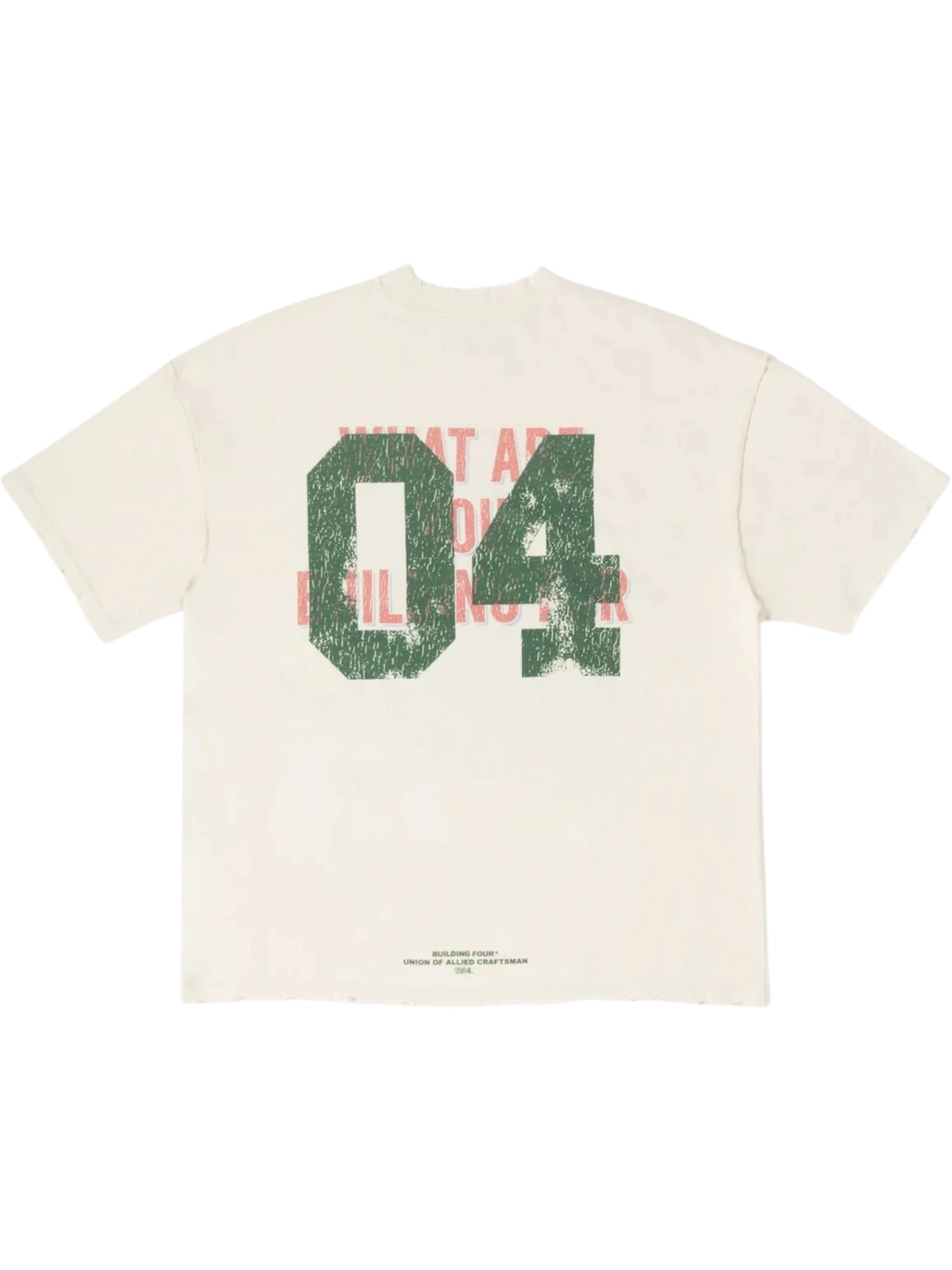 The back is anchored by an oversized “04” graphic layered over distressed typography, giving the piece a strong front-to-back presence. Subtle breaking along the collar, sleeves, and bottom hem adds a worn-in edge, while reverse seam construction keeps the silhouette intentional. Designed to feel cinematic and lived in, this tee balances visual weight with everyday wearability 100% Cotton.