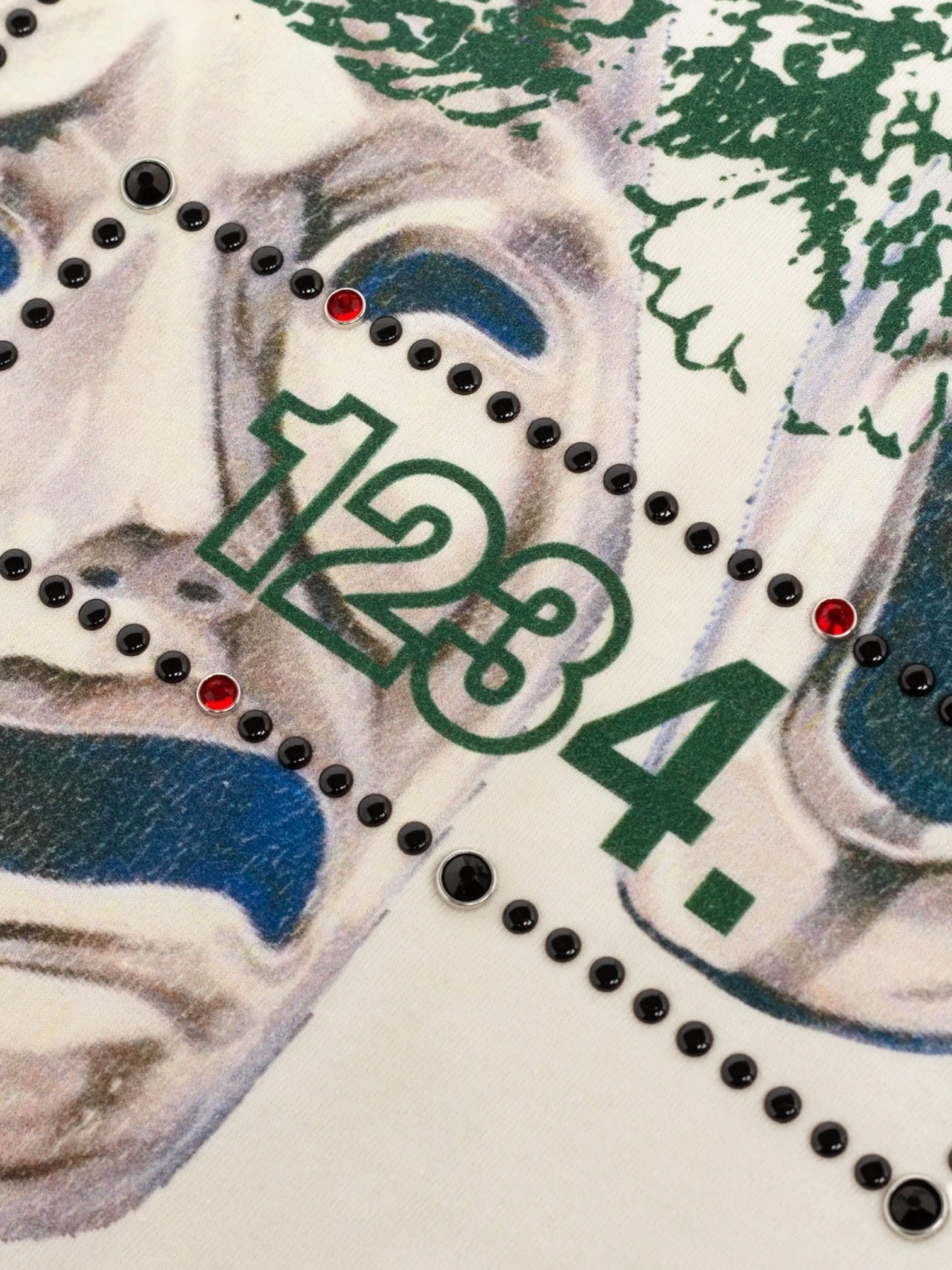 A graphic knit built with drama and dimension. The Notre Dame Knit is cut from midweight cotton jersey in a relaxed drop-shoulder fit and finished with a snow wash that gives the fabric a soft, faded depth. The front carries a bold collage of classical mask imagery layered with BLDG4 branding and hanging graphic elements, creating a surface that feels theatrical and collected rather than cleanly printed.