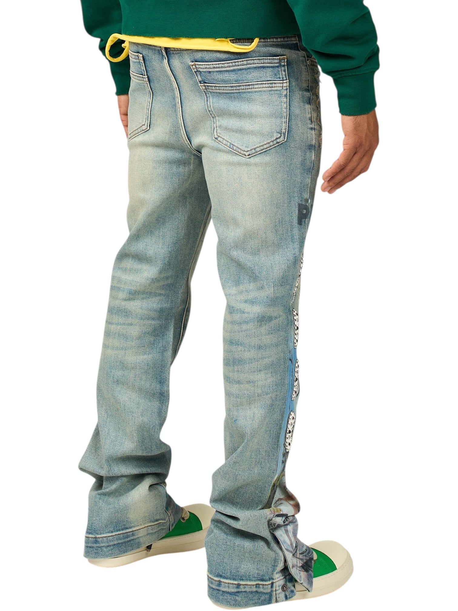 Elevating the design, a custom rhinestone pattern is layered throughout, adding texture and controlled shine that catches light without overpowering the print. The combination of detailed embellishment and standout artwork makes this denim a statement essential, perfect for bringing a high-energy, fashion-forward edge to any rotation.