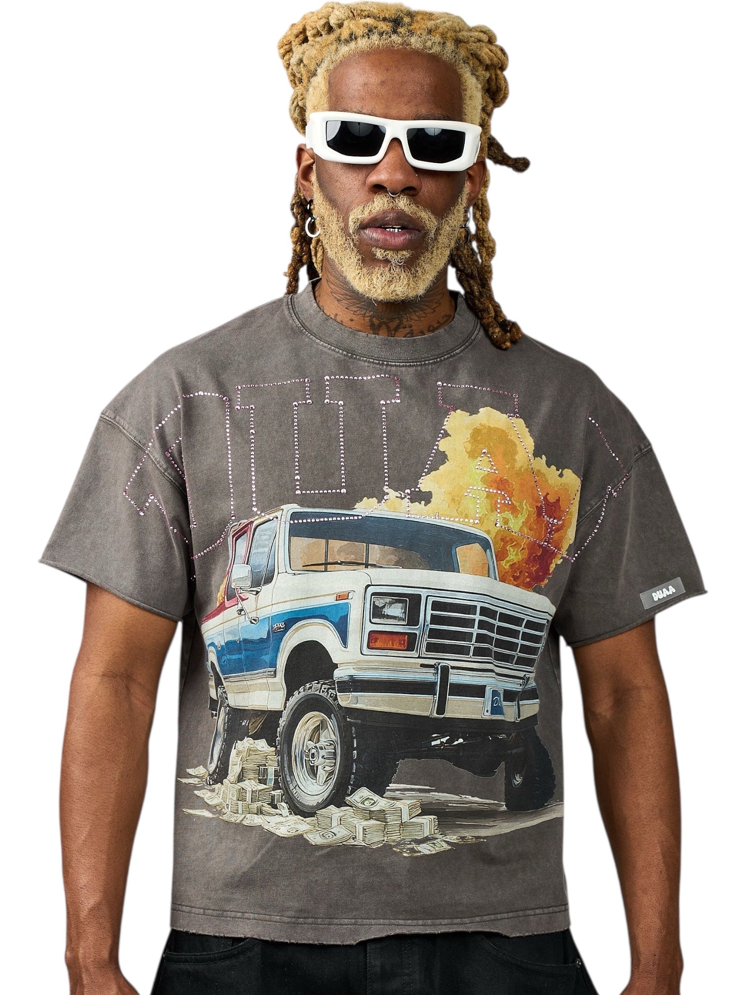 Duaa Pull Up Tee Shirt in Vintage Wash delivers a bold, rugged aesthetic with a worn-in feel that stands out effortlessly. Crafted from 100% cotton, the tee features a soft, breathable build enhanced by a vintage wash finish that gives it a naturally faded, lived-in look. The oversized truck graphic dominates the design, adding a raw, industrial edge that captures attention while staying rooted in streetwear culture.