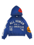 El Perro Hoodie Blue Wash - This All Human hoodie blends varsity inspiration with the brand’s signature graphic edge. The chest features bold ALL HUMAN DIV.1 ALL-AMERICAN 1994 lettering, while the sleeves include oversized bone artwork and a bright orange smiley patch. A red flaming logo sits on the hood, with an additional star-face patch on the back. Finished with a kangaroo pocket and ribbed trims, this piece delivers standout style in a soft, premium blue cotton fleece.