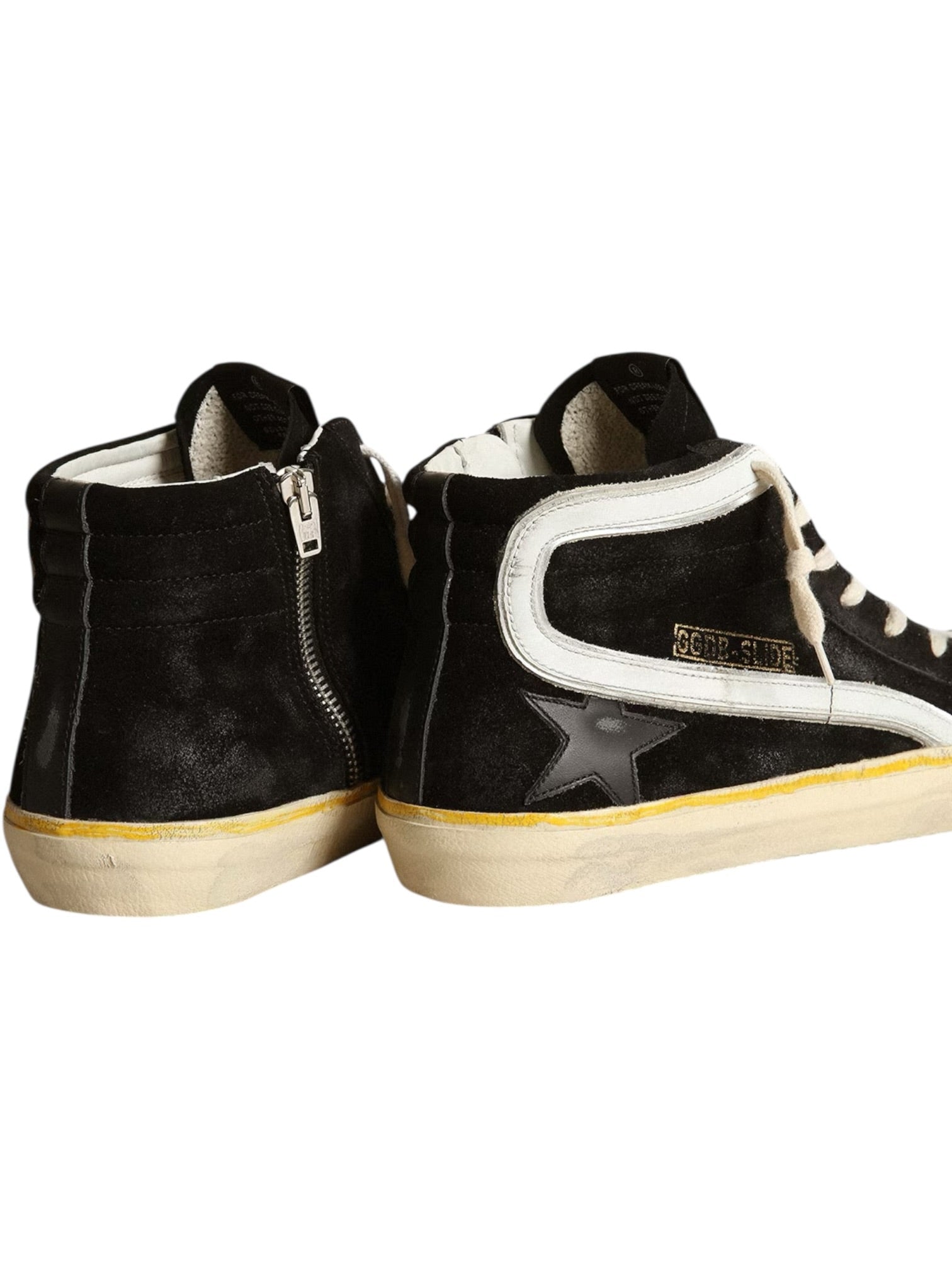 Skate soul, glamorous attitude. Our Slide sneakers take you straight to Venice Beach, between an ollie and a kickflip. This model with a black suede upper features a black leather star and heel tab and a white leather flash. The yellow stripe on the foxing and cream-colored laces add the finishing touch.