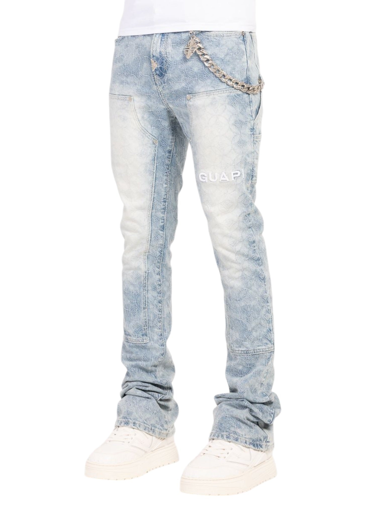 A structured silhouette is reinforced by oversized front paneling that adds a sculpted, almost armored dimension to the legs while maintaining comfort and mobility. Faded highlights across the thighs and knees enhance depth and movement, ensuring the denim looks dynamic from every angle. Signature branding appears through a raised GUAPI appliqué on the thigh and a vibrant yellow waistband label, while a detachable silver-tone chain with a branded charm introduces a jewelry-inspired accent. Finished with clean pocket construction and a modern flared hem, the pair blends everyday wearability with a distinct, runway-driven edge.