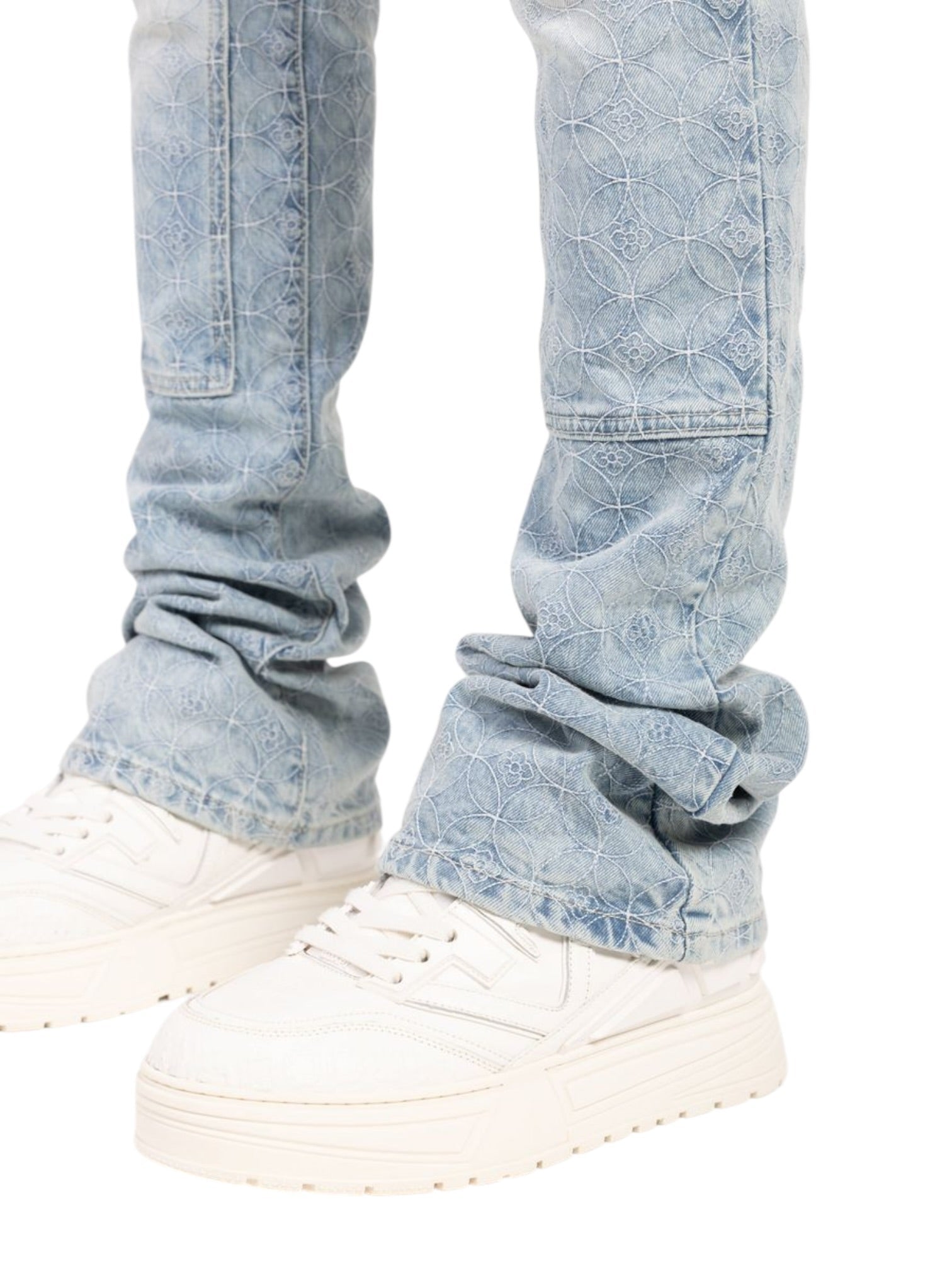 Aqua Blue Sashiko Denim delivers a refined yet expressive take on statement jeans, defined by its icy aqua wash and intricate all-over sashiko-inspired pattern. Up close, the detailing feels subtle and textural, while from a distance it creates a bold, eye-catching effect. The design strikes a balance between craftsmanship and attitude, giving the denim a polished, luxury streetwear presence that stands out without feeling overdone.