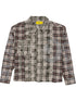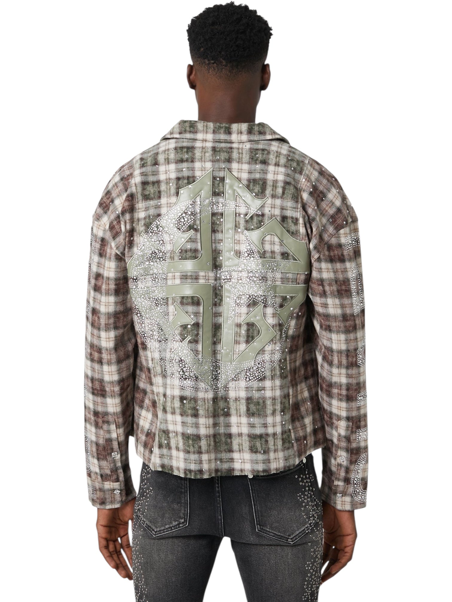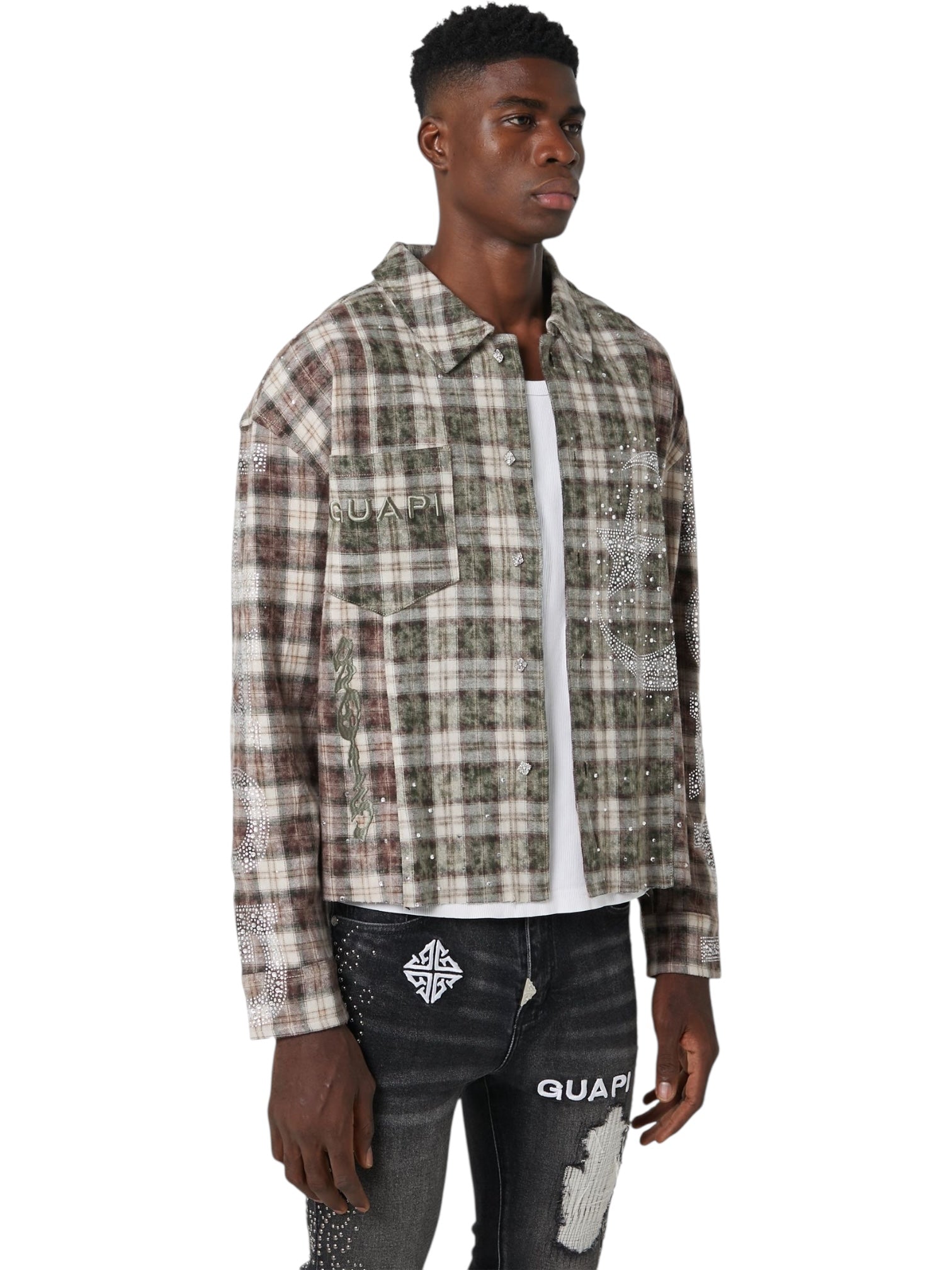 The Mocha Crescent Flannel redefines classic plaid with GUAPI’s signature fusion of rugged form and radiant detail. This earthy-toned flannel shirt jacket features a mocha, forest green, and cream tartan base crafted in soft brushed cotton for a structured yet cozy fit. The oversized silhouette is designed for layering, with a boxy cut and dropped shoulders that enhance its streetwear appeal.
