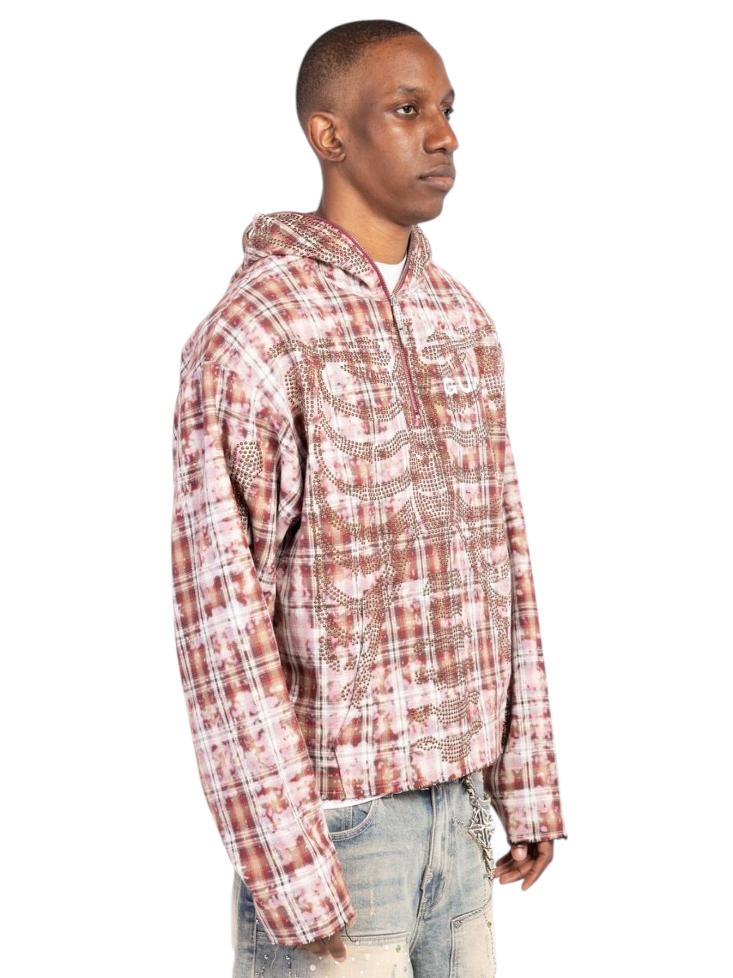 Rusty Skeleton Half Zip Hoodie reimagines a streetwear essential with a bold, subversive edge. Built on a washed plaid base in rusty reds and muted neutrals, it delivers a vintage-inspired foundation that feels both worn-in and intentional. Across the torso and sleeves, a striking skeleton graphic is brought to life through dense stud-style detailing, creating a controlled shimmer that adds depth and texture without overpowering the design.
