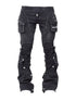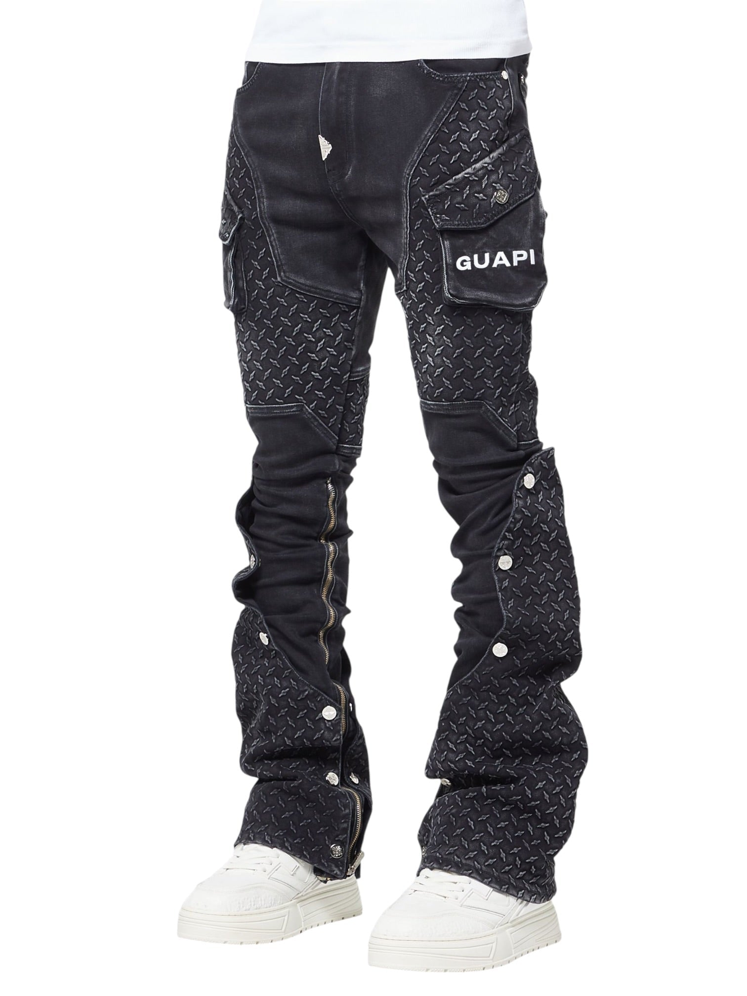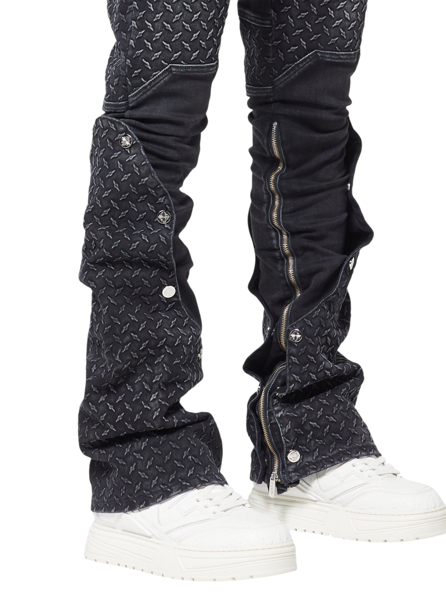 Oversized cargo pockets with distressed flaps enhance the utility aesthetic, while the sculpted seam work gives the jeans a sharp, engineered shape. The stacked-leg construction, paired with full-length outer zippers and snap-button details, allows the wearer to customize the silhouette, whether kept slim or opened for a more flared, layered effect.