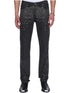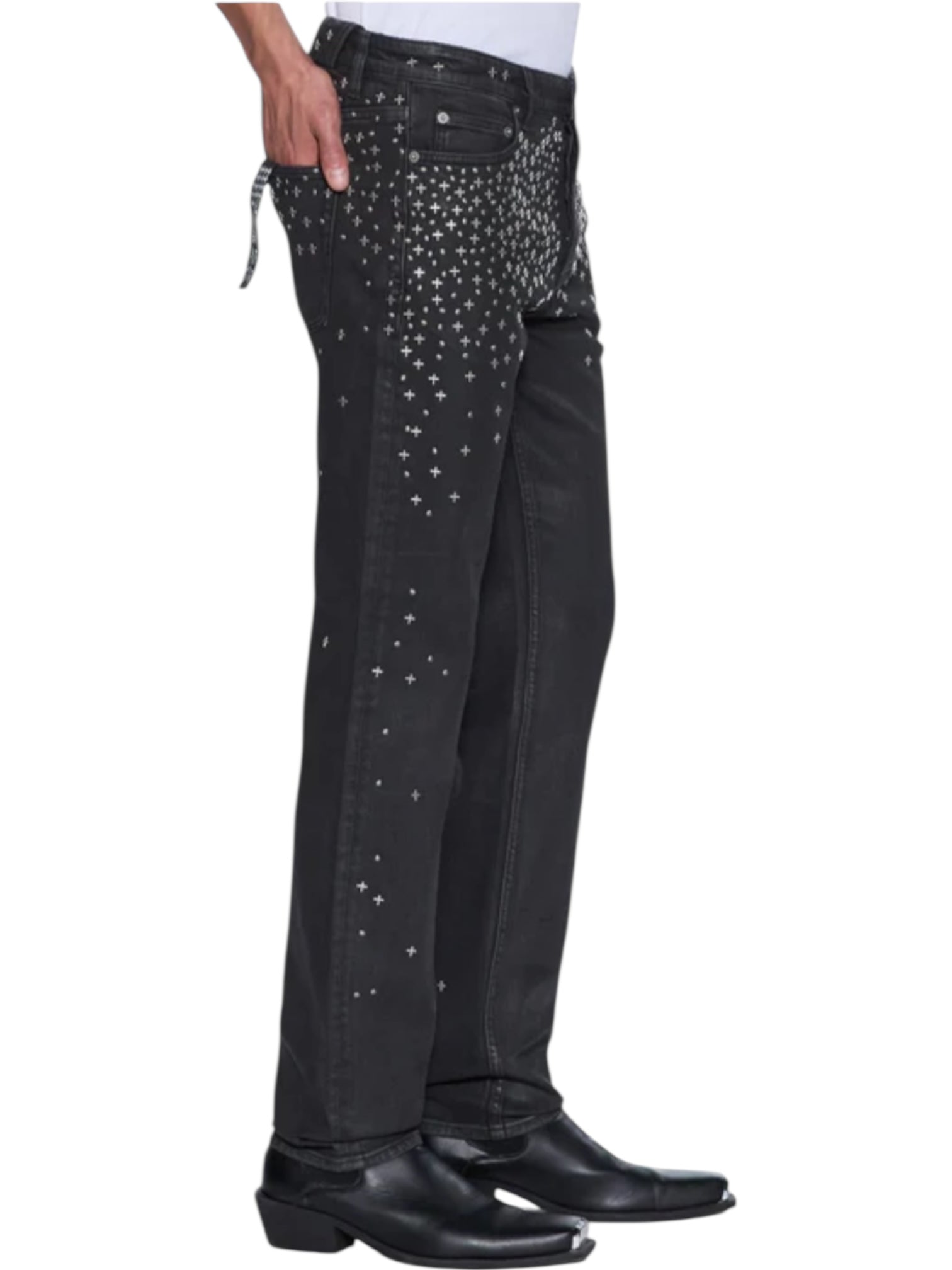 The Chitch Backstage Black Metalik is a slim tapered jean with a mid-long rise and signature Dutch tab. Made from premium comfort stretch black denim with a waxed-look resin coating, it features a compact assortment of metal studs in multiple shapes cascading down the jean, finished with signature T-box and 4x4 embroidery and Ksubi hardware.