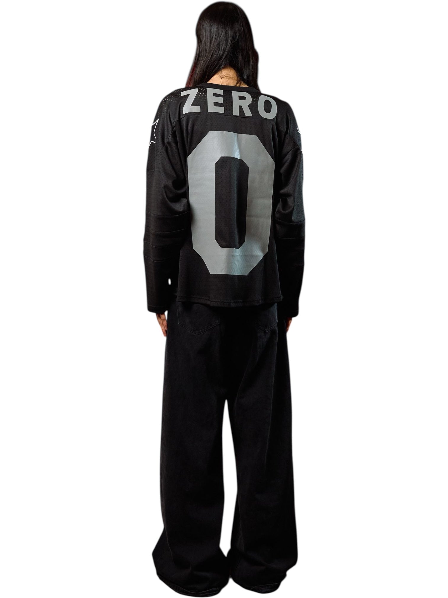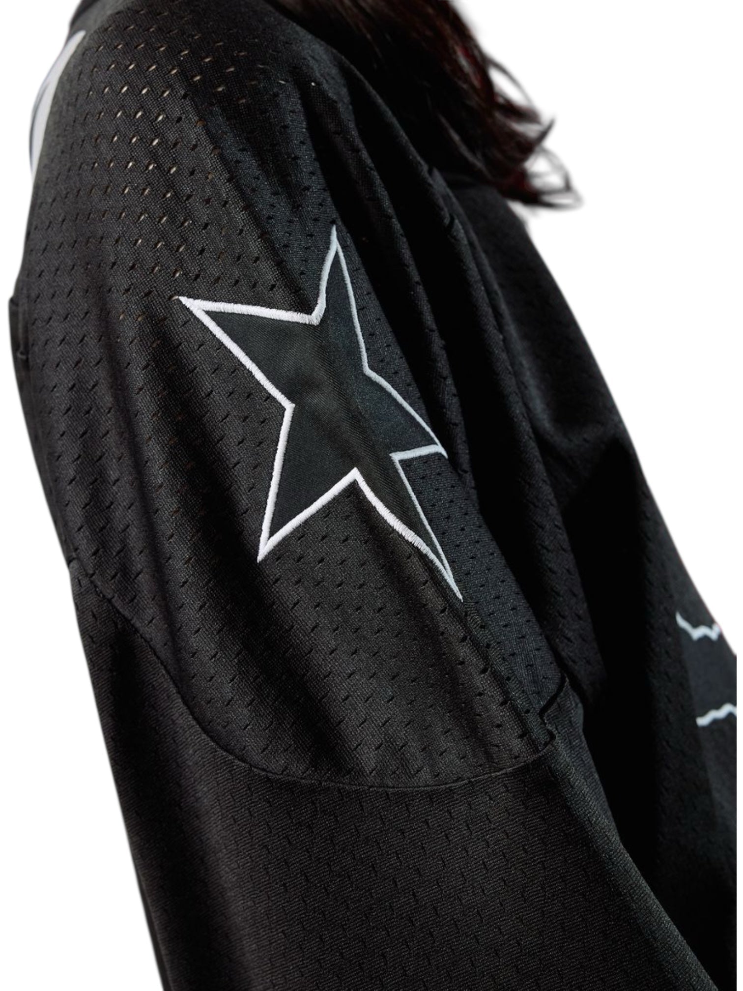 Appliqué and printed graphics are placed throughout, creating strong visual impact and added texture against the black base. The mix of stitched detailing and sharp prints elevates the piece beyond traditional sportswear, blending authentic hockey inspiration with contemporary street style energy.