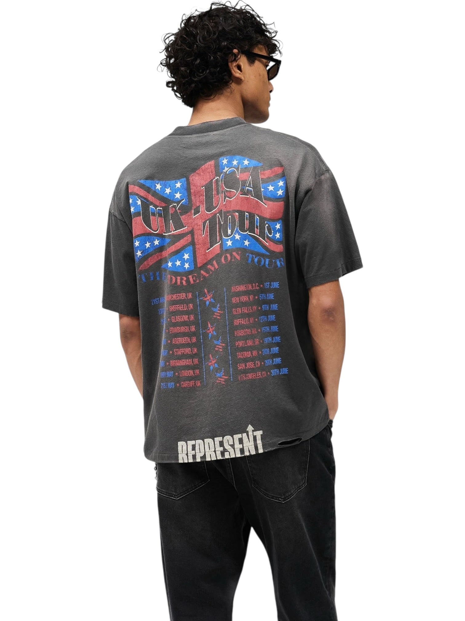 Represent MLM100593-46 Dream On Tour T-Shirt in Sun Fade Grey delivers a vintage-inspired aesthetic with a modern oversized silhouette. Crafted from an 85% cotton, 15% hemp blend, this 160gsm lightweight jersey offers enhanced breathability while maintaining a soft, broken-in feel. The washed finish creates natural texture and subtle fading, giving the tee an authentic, worn-in character. Tour-inspired Dream On graphics are printed on both the front and back, adding bold visual impact to the understated grey colourway.