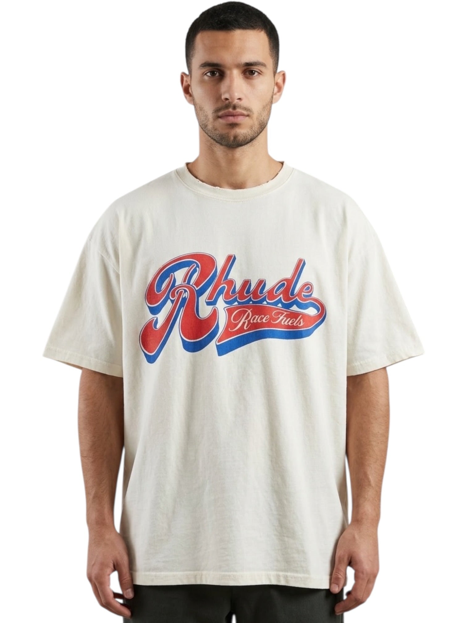 Designed with an oversized, boxy fit, the tee features a vintage-washed white base accented by bold red and blue pit-stop racing graphics across the chest. The classic ribbed crewneck collar and relaxed silhouette enhance its laid-back streetwear appeal, making it easy to style with denim, cargos, or shorts for a modern casual look. Like many Rhude tees, it embraces a slightly oversized fit intended to be worn true to size for the brand’s signature relaxed profile.