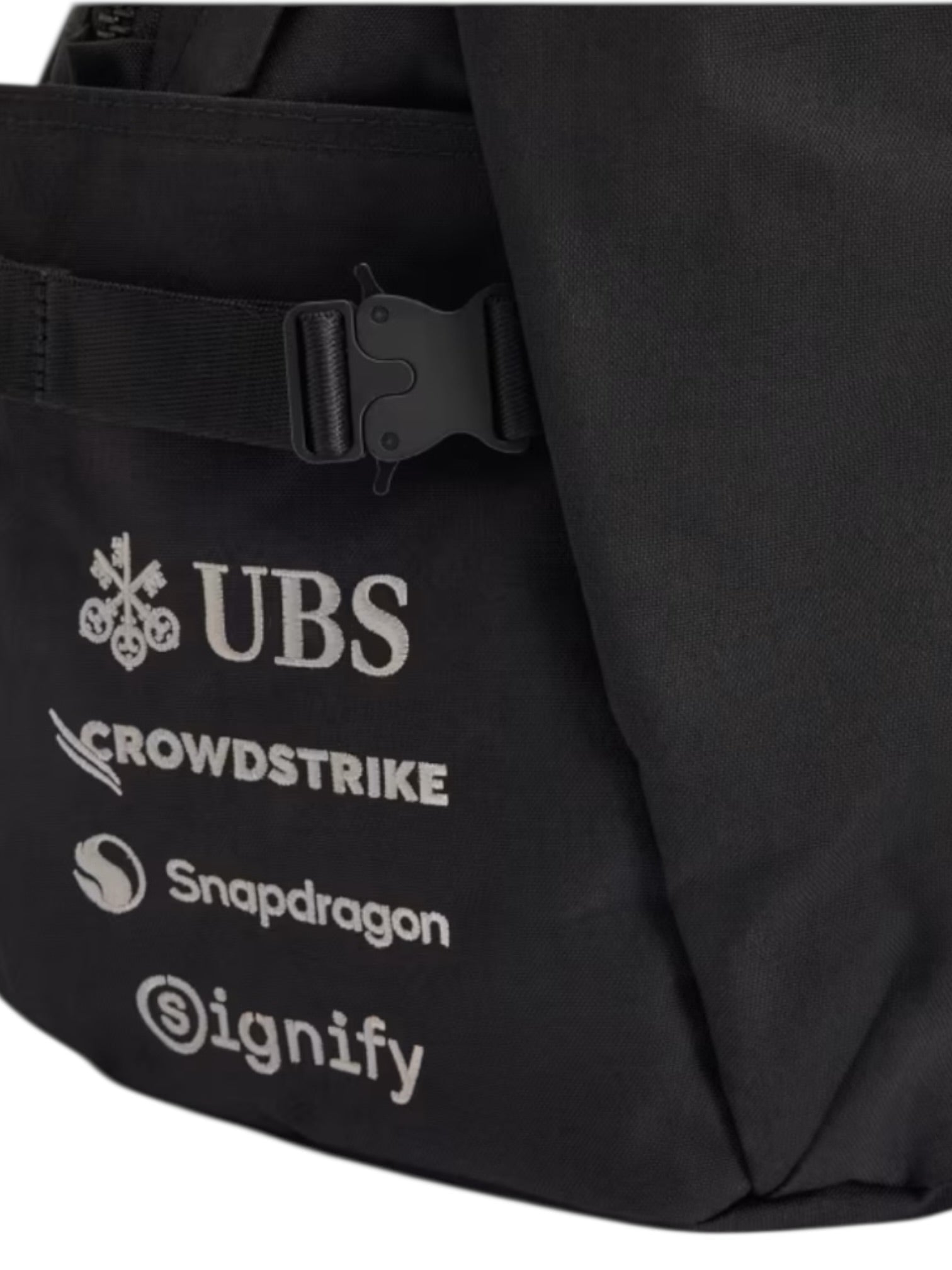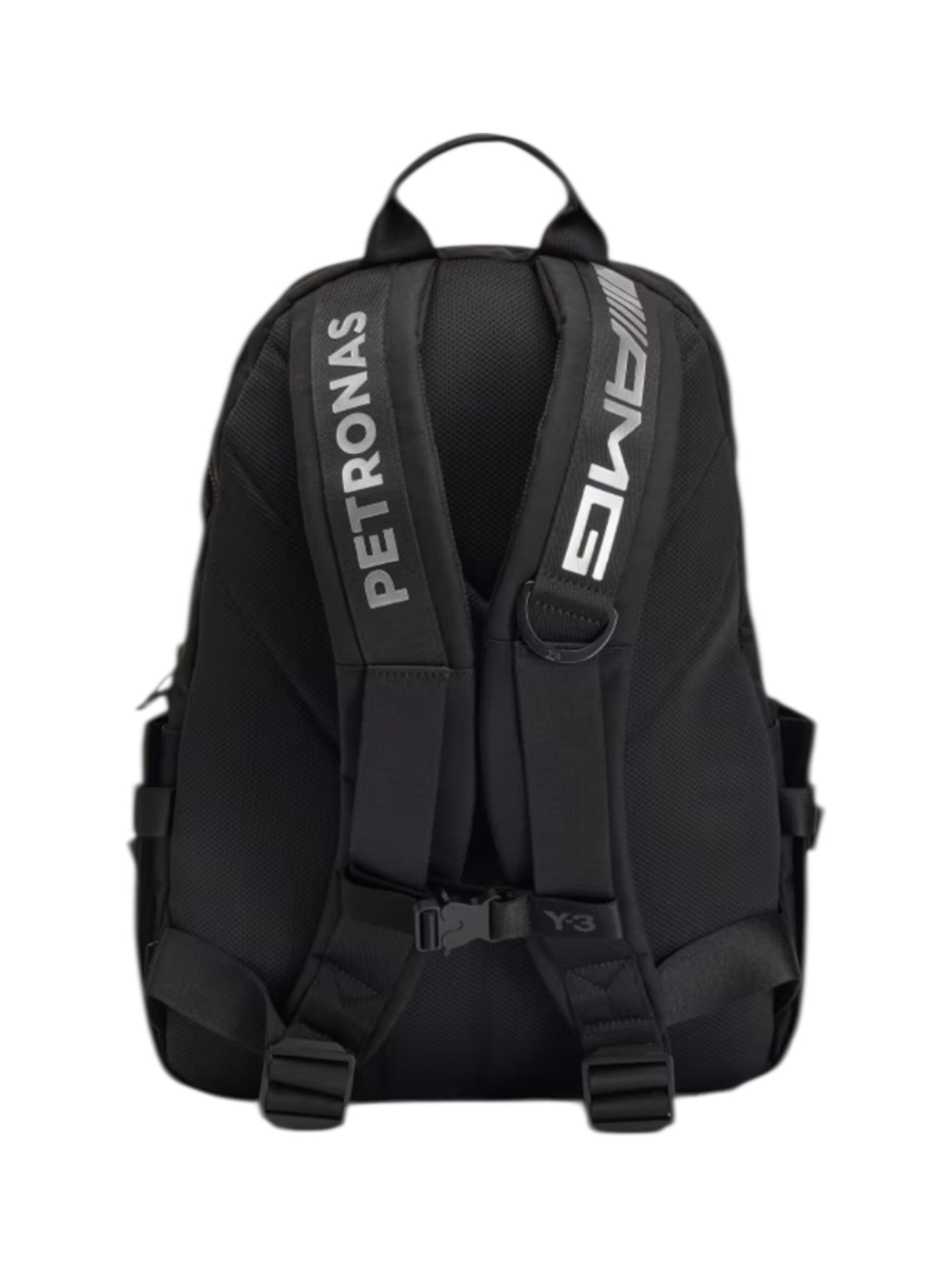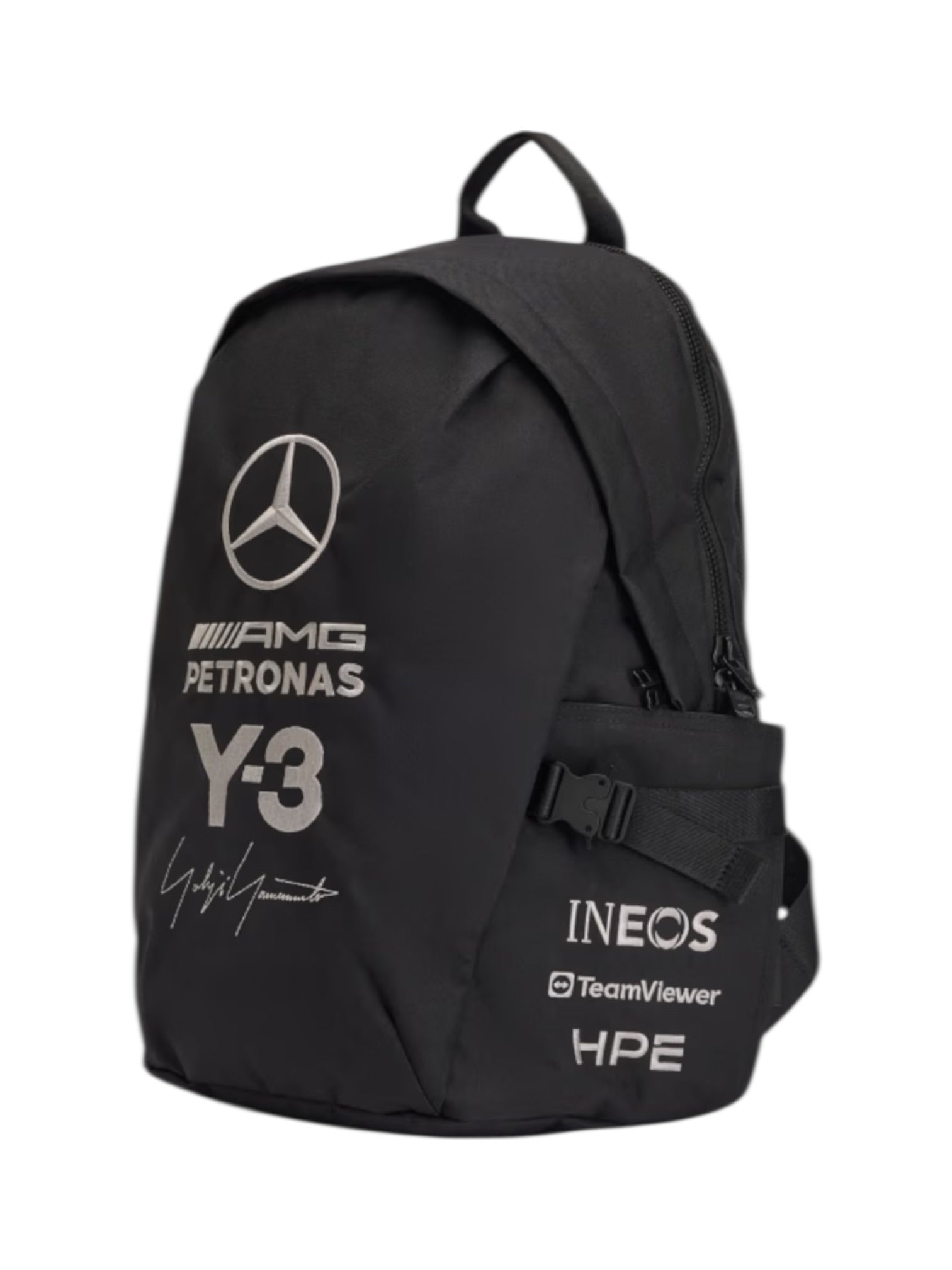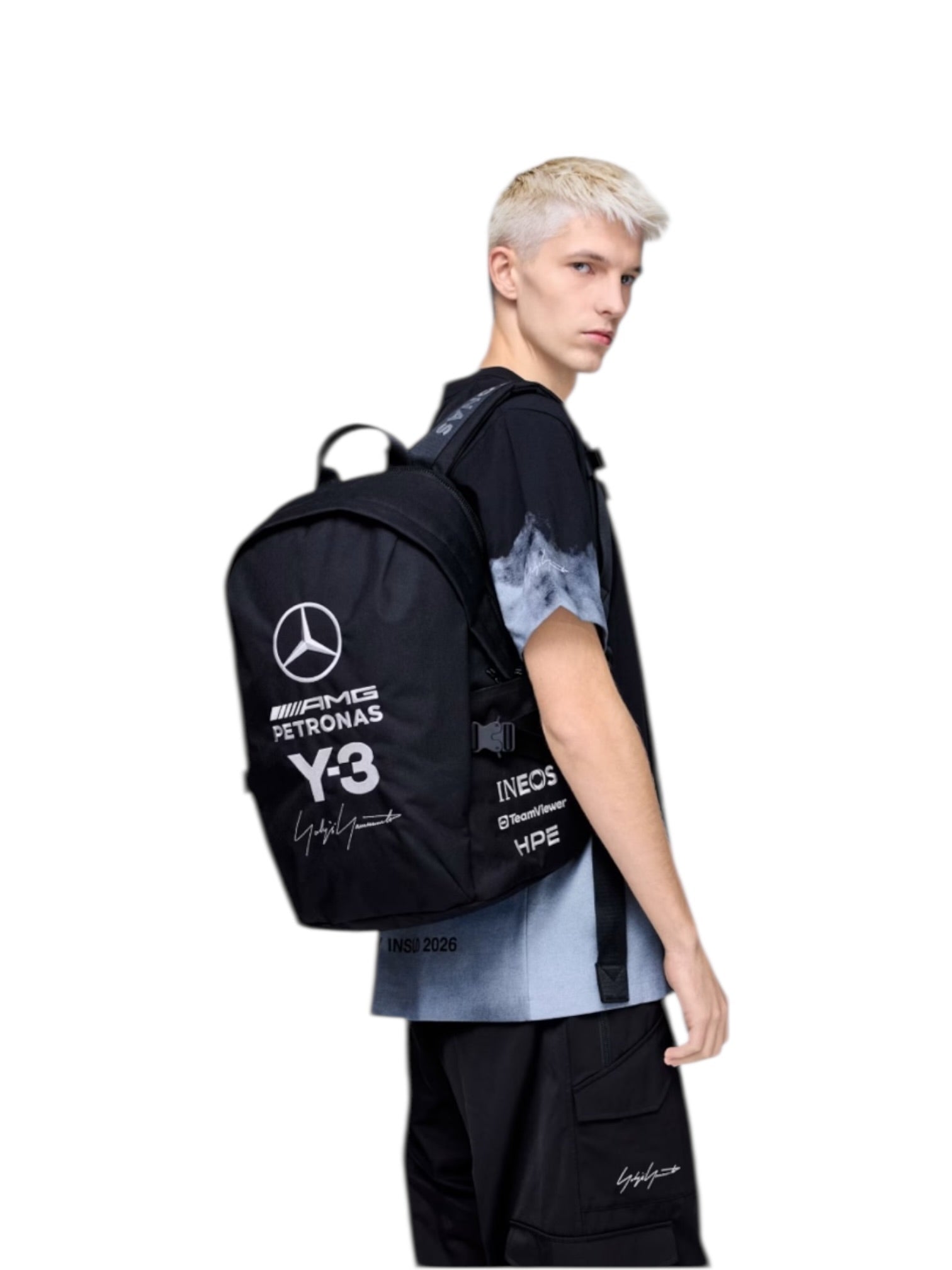 Sporting the collaboration’s signature logo prominently, the backpack also incorporates printed Petronas and AMG logos on the webbing straps and sponsor graphics along the sides, reflecting its Formula 1 inspiration. The rain cover’s all-over Wolf graphic adds a bold, graphic edge, creating a visually dynamic accessory that perfectly balances functionality with high-fashion appeal. Imported and finished in classic black, the Y-3 Mer BP is an essential statement piece for fans of motorsport-inspired streetwear.